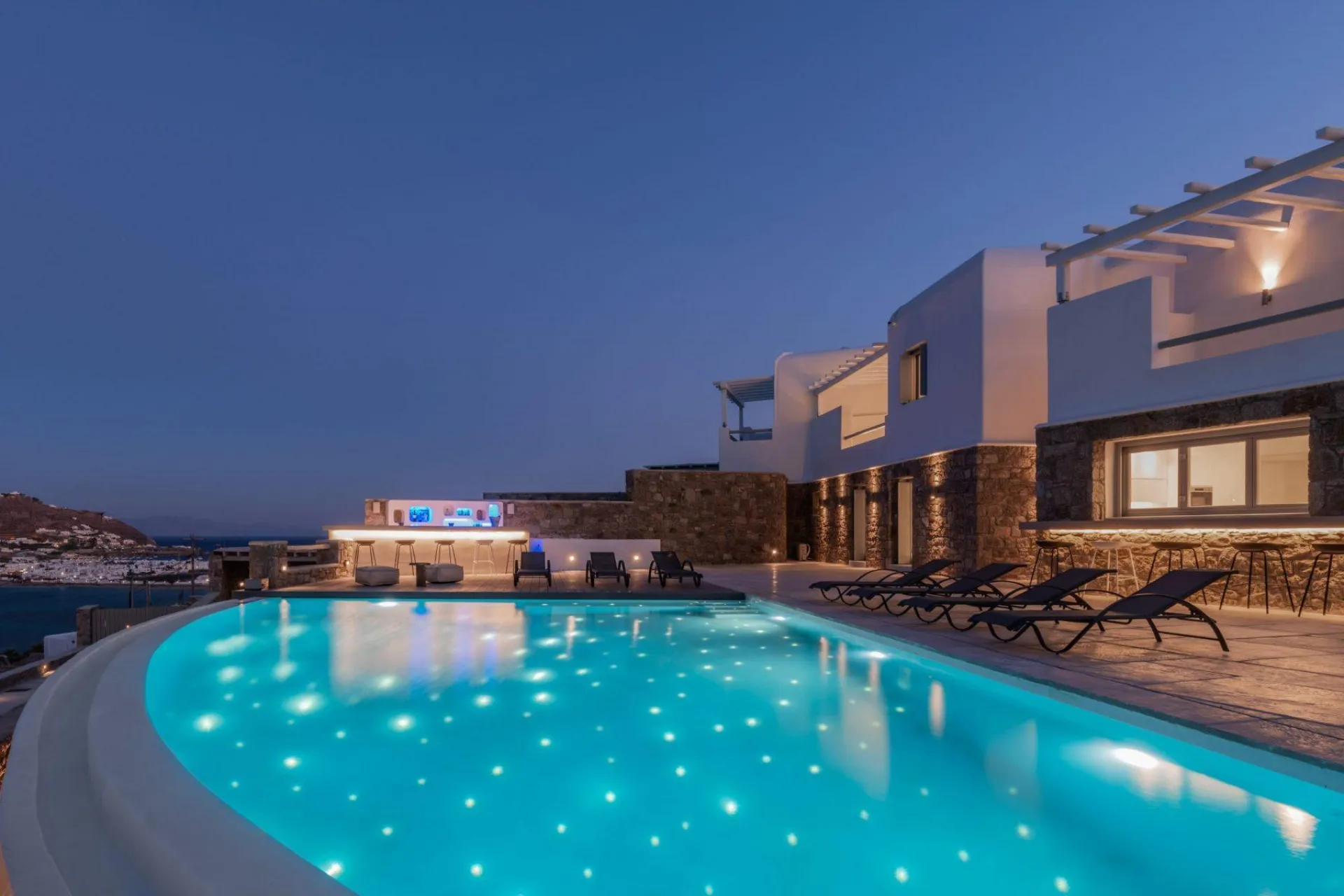 The other outdoor entertaining areas which are consisted of a large bar with a custom-designed back shelf composition and a sun lounge deck area, are harmonically placed around the infinity swimming pool which overlooks Mykonos Town and offers the impression of swimming inside the Aegean.