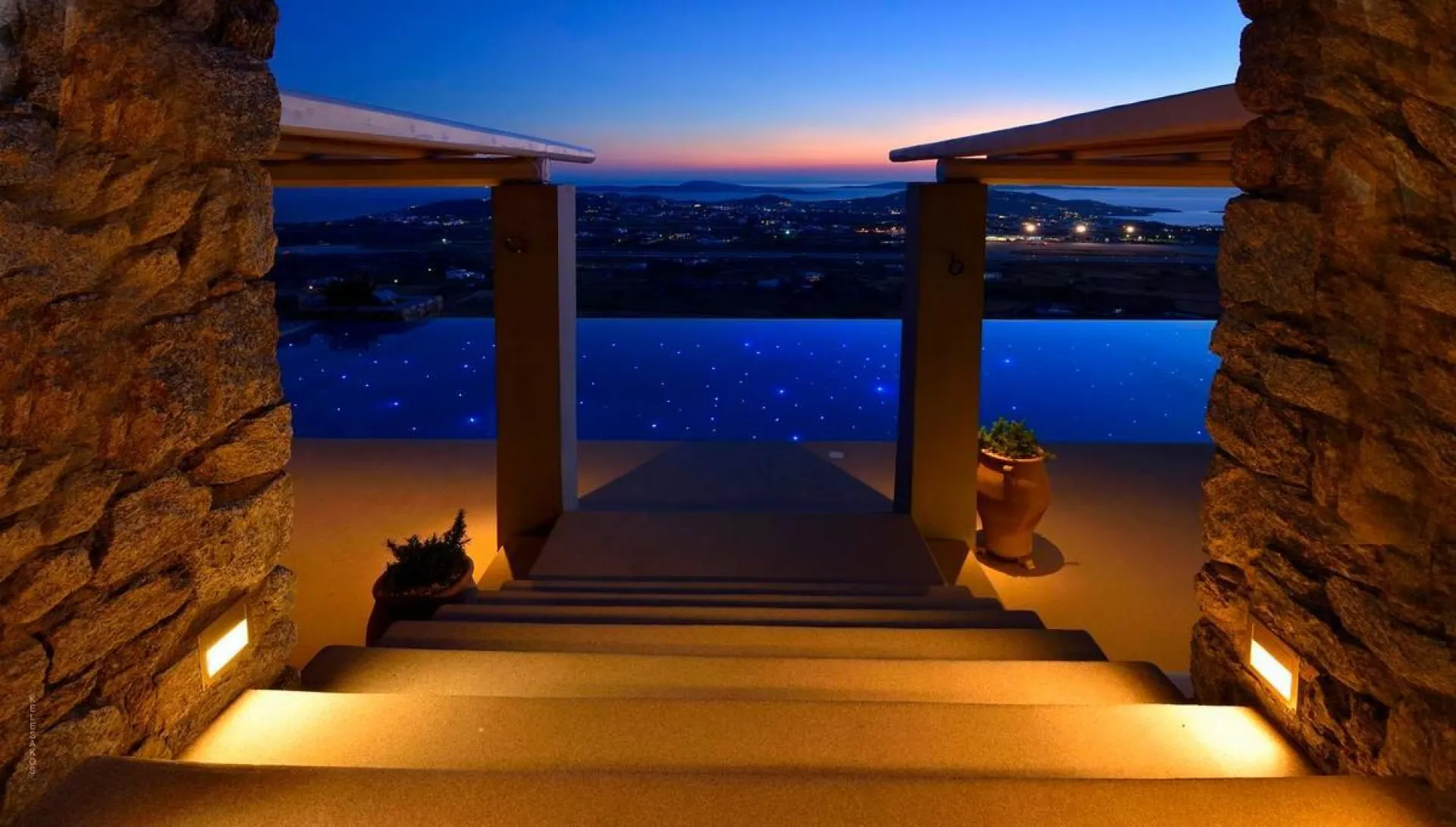Inspired by the colors of nature, the villa blends in with the landscape making it almost transparent. A huge beach-end infinity pool with a jacuzzi, unique gardens combining all shades of the island, and incredible panoramic-view exteriors are only some of the villa’s irresistible traits. Soak up the sun on the comfortable loungers, relax with a book at an elegant sitting area with the built-in sofas, and dine alfresco at the big, modern table under the pergola by the pool, that boasts a panoramic view of Mykonos Island. Stay there until the sun sets; during nighttime, the fiber optic star floor of the swimming pool will feel like a festival of dancing lights!