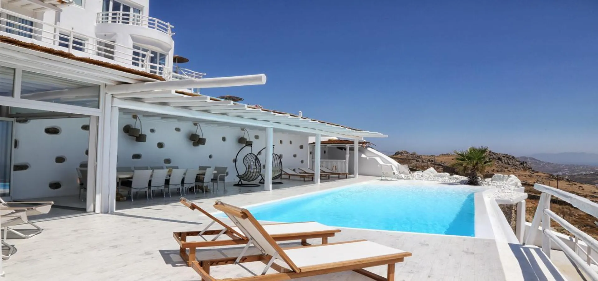 - King-size master suite with en-suite bathroom, king-size bed, safe box, A/C, TV, unobstructed views to the Aegean from each corner, private veranda with sun beds, and private wooden deck