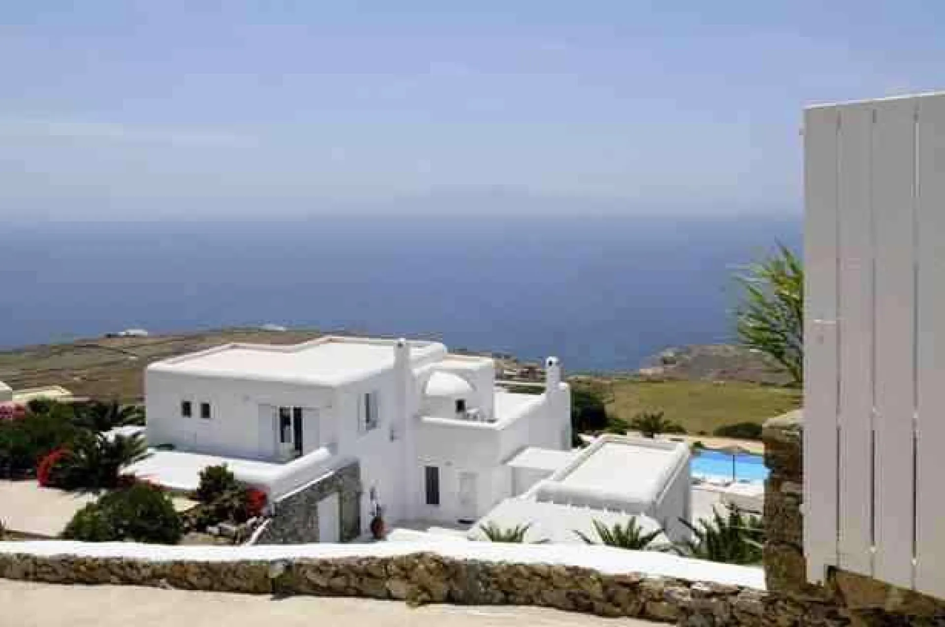 Located on a hilltop above Lia Beach, Mykonos Villa Doris a secluded, very large modern villa offers generous spaces, a huge and sunny pool area, fantastic sea and countryside views in a tranquil setting. Very good value for large groups. This attractive, contemporary style villa comprises both a main and guest house with separate entrances. Both are similarly styled. Flowers and small palm trees stud the spacious outdoor areas which feature a rectangular infinity swimming pool and many terraces. 5 bedrooms with twin (joinable) beds & A/C, ensuite bathroom. Guest House: 6 guests 3 bedrooms with twin (joinable) beds & A/C, ensuite bathroom. All twin beds can be joined together as double Private Infinity Pool, heated jacuzzi.