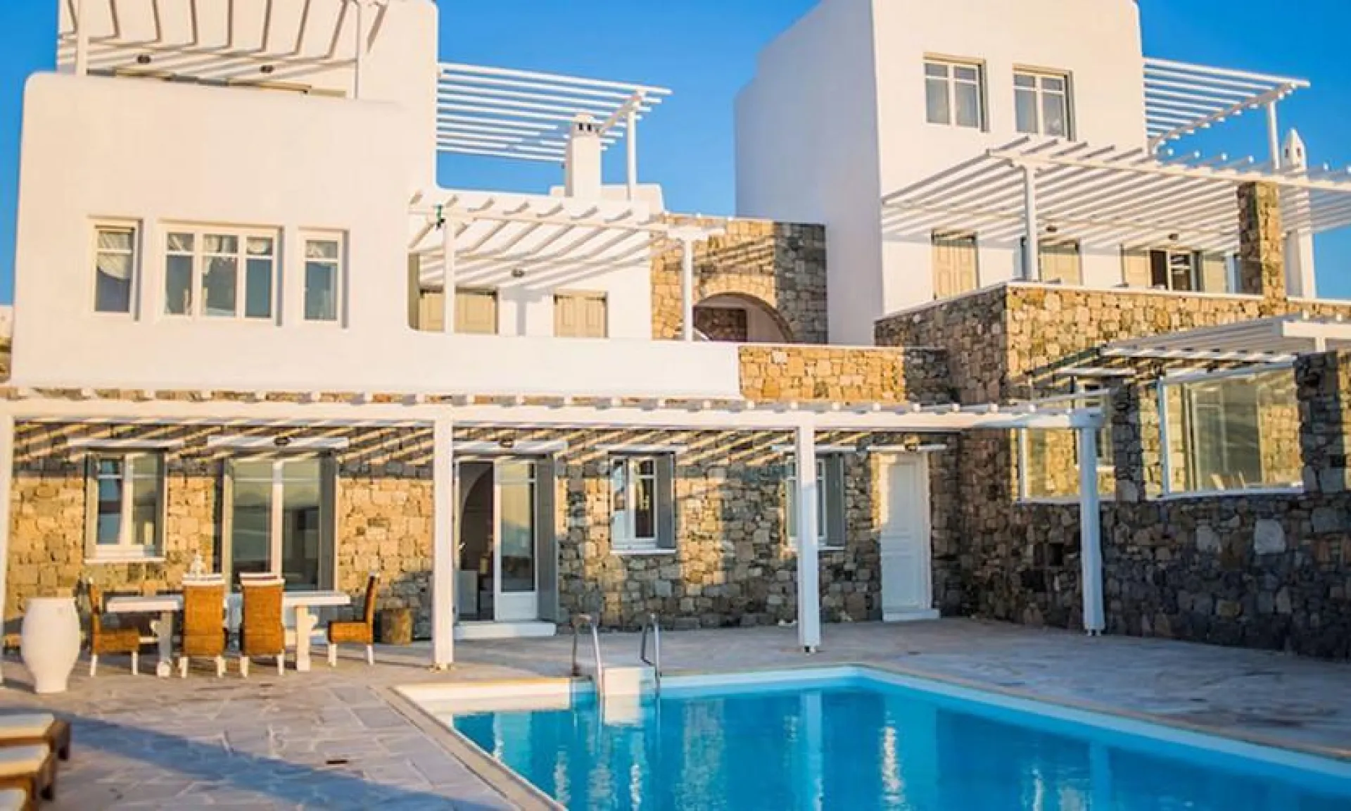 Take the opportunity to stay at Villa Eli in Mykonos with incomparable interior and exterior qualities. Relax at the sun lounge beds of the fully wind-protected pool area, right above the crystal blue-green waters. The spectacular 360° views of the villa will offer you a one of a kind vacation experience in Mykonos. After your refreshing swim, have a delicious BBQ dinner under the white pergola, or enjoy a glass of wine at the private terrace of your beautiful bedroom. At the southwestern part of the island, just 1km from Agios Ioannis beach and 1,5km from Ornos beach lies the Pouli hill, a residential area in a premium location enjoying the most idyllic views of the island, the Aegean Sea and the neighboring island of Delos. Situated in a high and serene location, Pouli hill offers the most mindblowing sunsets of the island paired with a magical sense of freedom! Its proximity to Mykonos Town provides to our guests the opportunity to escape or “dive in” the nightlife whenever they desire.