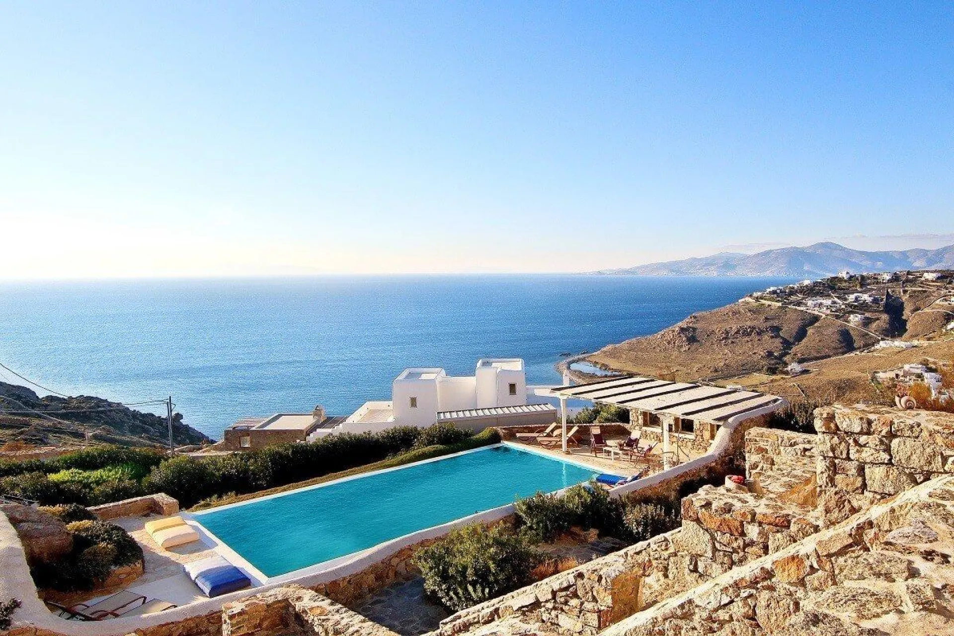 Agios Stefanos Beach with its crystal clear waters, cafes, and restaurants is a short drive away. Mykonos Town and the old port are approximately 6 km, while Mykonos’ new port is about 3km away. This breathtaking villa with its idyllic setting is guaranteed to brighten up your stay on the sparkling island of Mykonos.