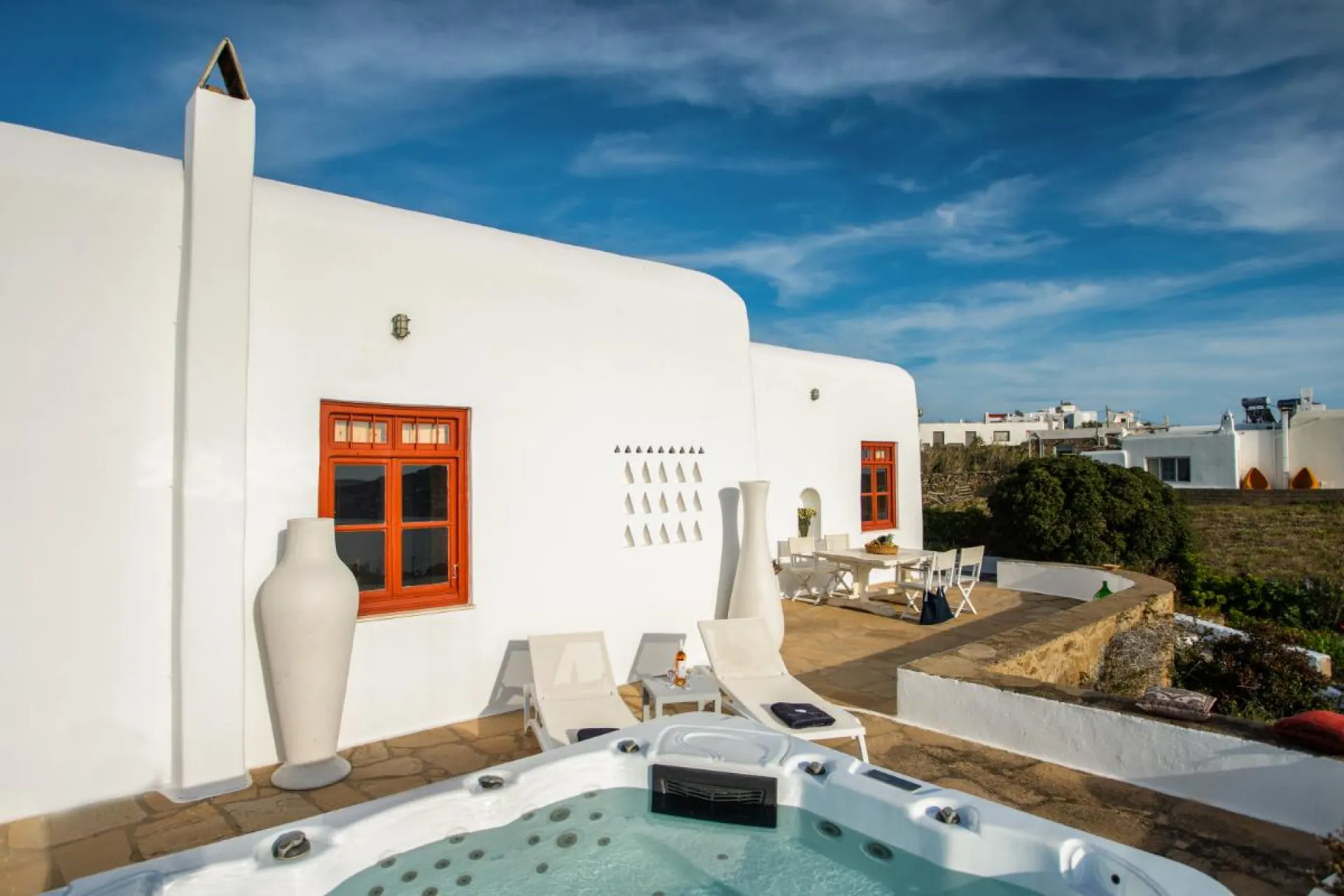 The house is characterized by wooden floors, high ceilings, and many windows that allow plenty of sunlight to fill the interior space. Moreover, its outdoor lounge area offers some of the best sunsets you can experience, looking over Mykonos town and the windmills. And take off this experience by relaxing in the hot tub.