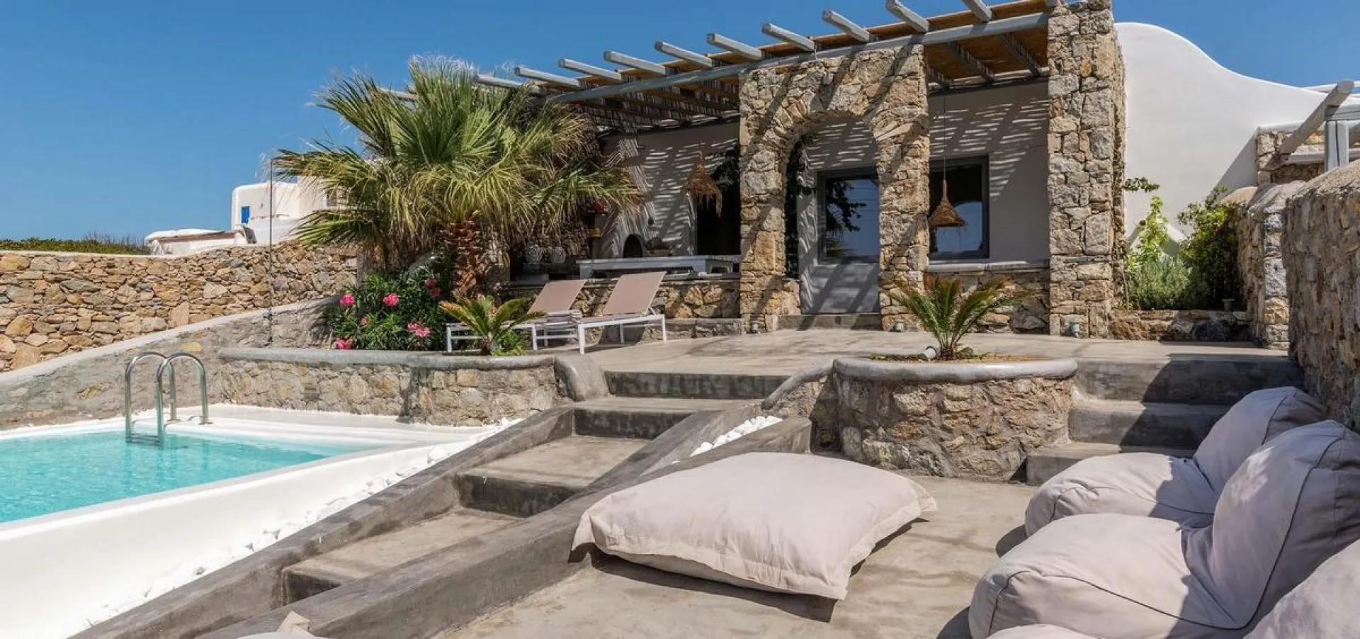 Take in the amazing views stretching across the Aegean to Rhenia and Delos from the villa’s modern terrace, which boasts a private swimming pool, plenty of sun loungers, and a traditional-style pergola with two alfresco dining tables and a wood-fired BBQ. Fix a drink and watch the sun go down or unwind on a beanbag lounger with a book before you get back to your villa and get ready for an unforgettable night out in Mykonos, the cosmopolitan capital of Greece.