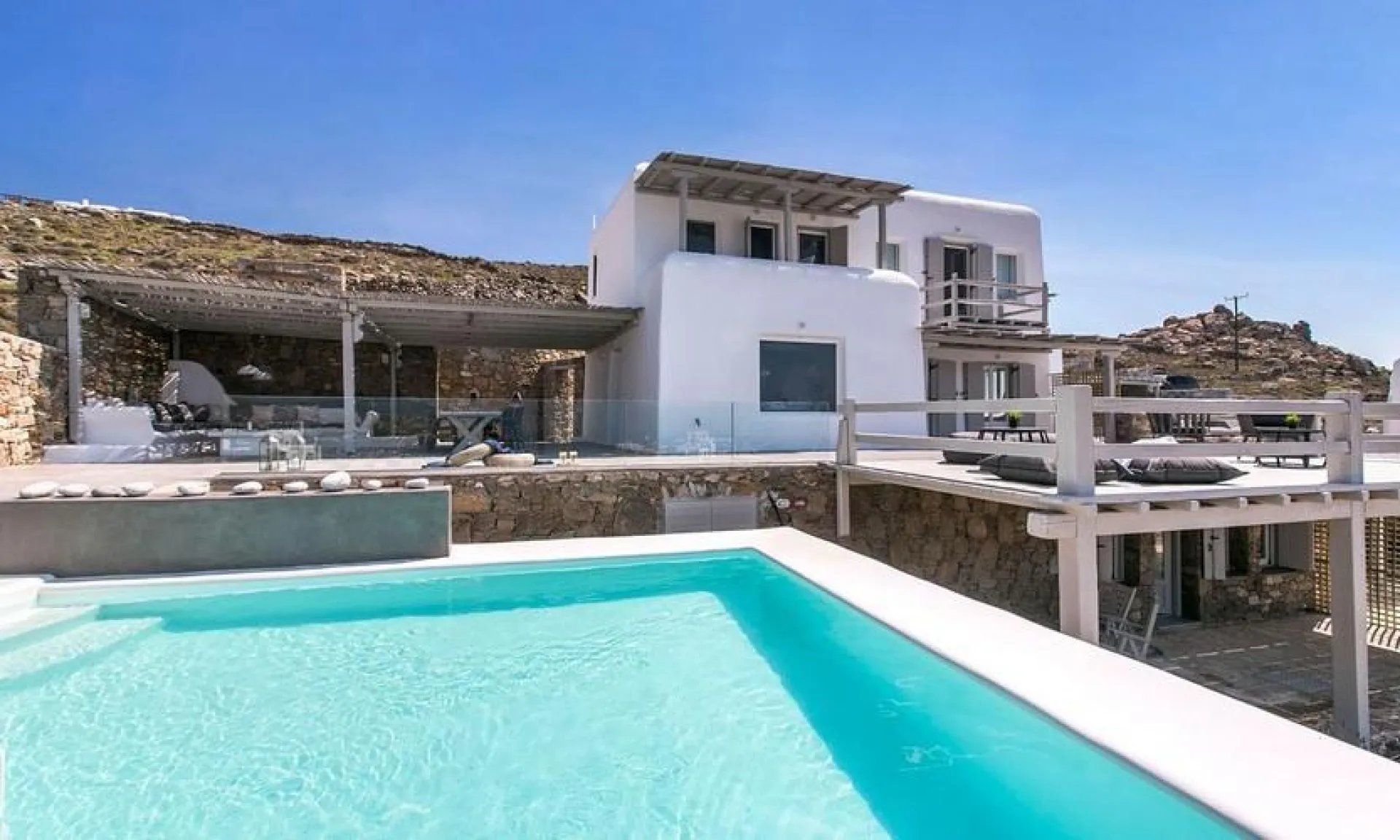 The luxurious and spacious Villa Klasse in Kanalia, Mykonos is at your disposal. Its gorgeous architecture, remarkable setting and the deep blue of the Aegean that surrounds it make you feel like you’re in heaven. Villa Klasse is located in Kanalia Mykonos and can sleep 8 people very comfortably. Its proximity to Mykonos town makes it a very appealing choice for fun-seekers and Mykonos airport is only a 12-minute drive from the villa. Sounds good? Keep reading… this breathtaking villa has so much to offer. The upper level includes a master bedroom with king sized bed (plus an en-suite bathroom) as well as two double bedrooms and another bathroom. The pool level has an ample-sized living and dining room as well as a fully equipped kitchen for meal preparations and early morning coffee gatherings. Finally, the ground-level structure with a private exterior entrance includes another master suite and an en-suite bathroom with sea views. The flexible sleeping arrangements make it a breeze for parents with children or couples traveling without finding their private space in this gorgeous villa. The purity of the white walls inside and out lends the structure a dream-like, ethereal feeling with modern yet minimalist furniture and finishes throughout. Arches and double pane windows and patio doors grace the villa and let welcome sunshine in while enjoying a warm awakening. Ornos Beach is only a five-minute drive from the villa… lovely! Lovelier so is the fact that after a fun-filled day out exploring the island, one can take an evening dip in the pool and rest on the inviting plush sunbeds. Villa Klasse offers beautiful exterior landscaping complete with a breathtaking pool resting at the crest of the Villa’s grounds, unobstructed sea views, a shaded dining area as well a wooden deck with lounge areas. Yours to spoil your senses!