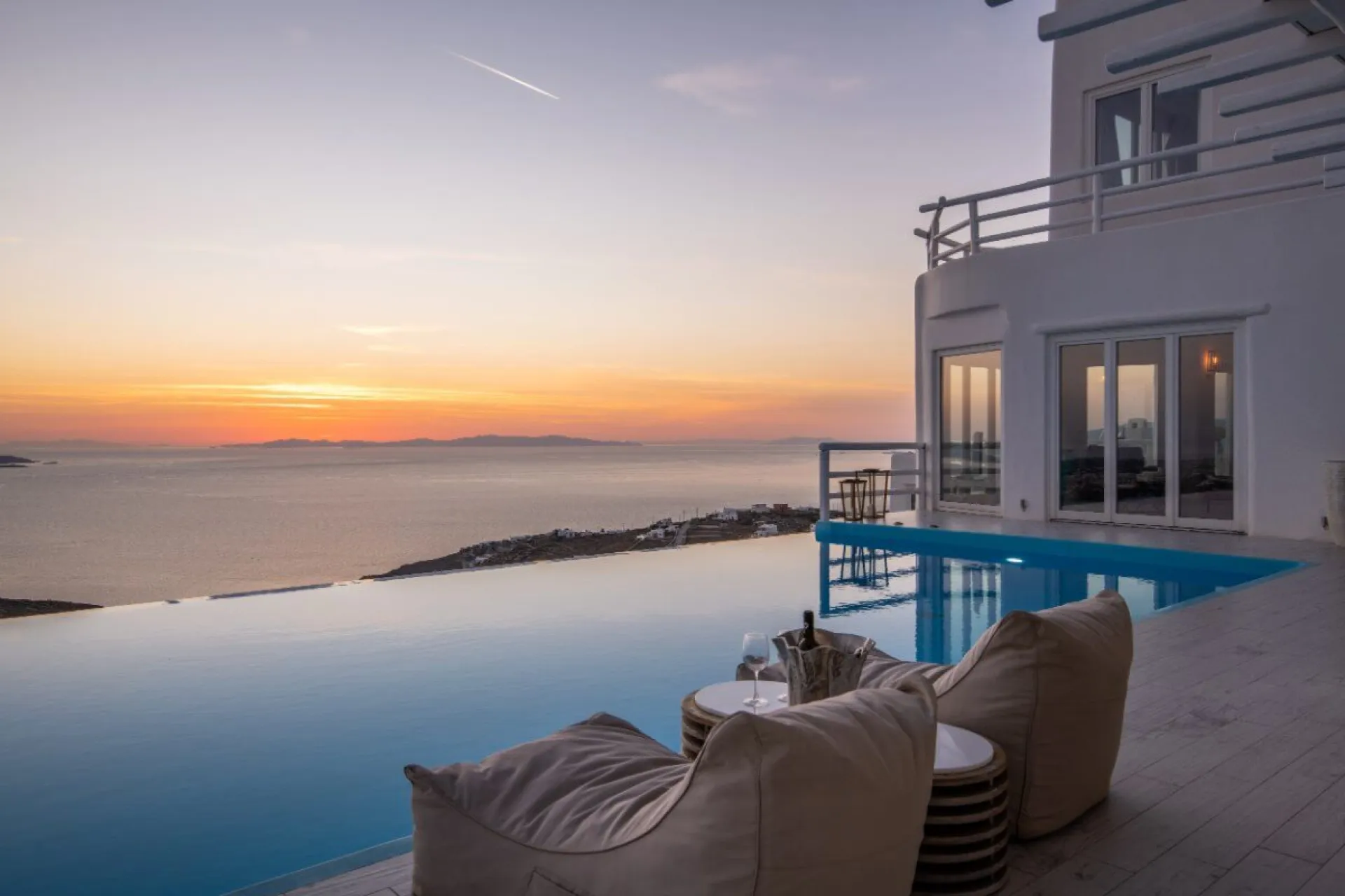 The amazing Villa is an impressive luxurious property located on a hilltop in the area of Fanari that enjoys the panoramic view of the infinite blue of the Aegean Sea and of Mykonos Town, as well as of the neighboring islands. In the evening hours, during the sunset time, unique sky hues create an idyllic atmosphere; while at night, you can see thousands of tiny lights simultaneously twinkling across the night landscape.