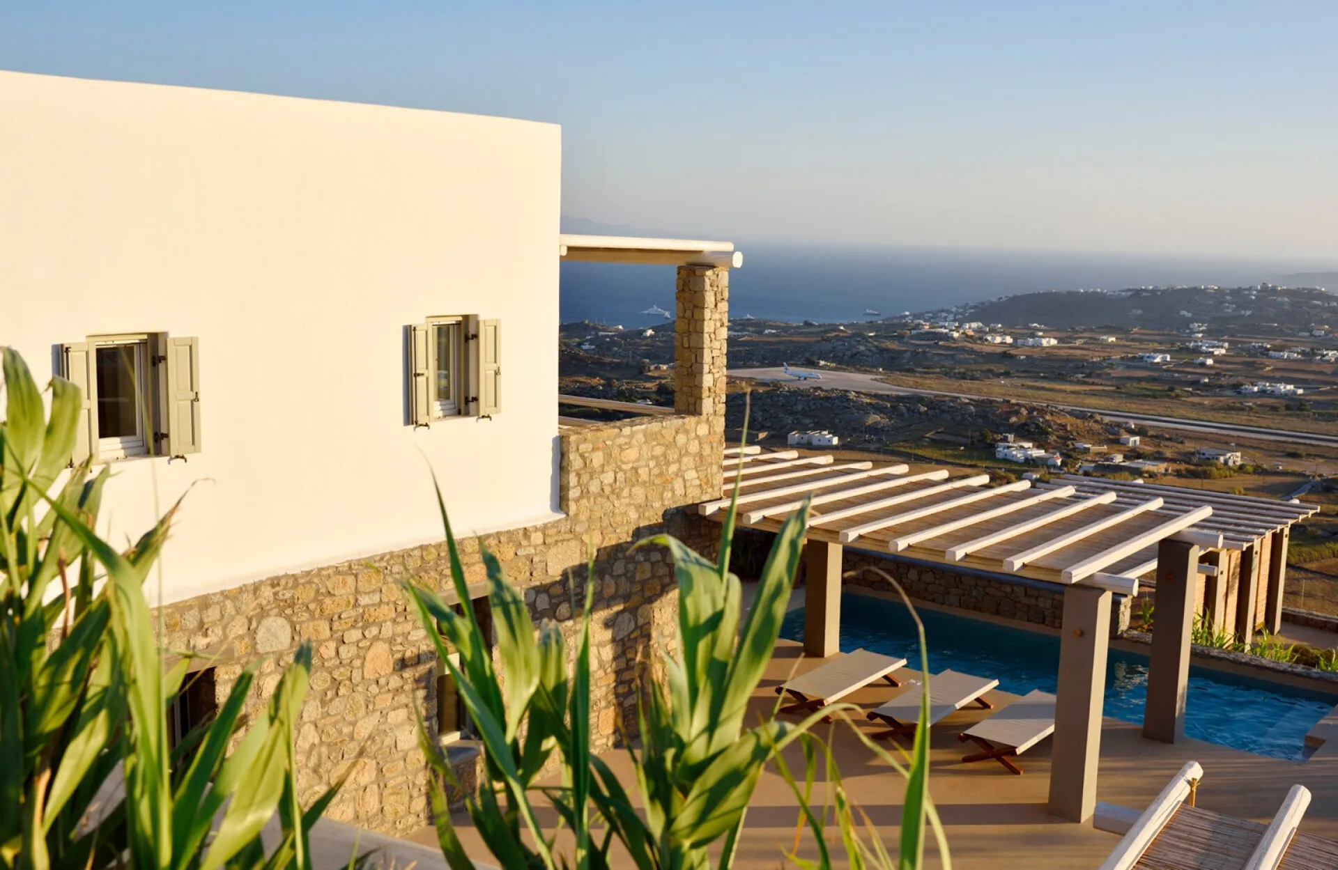 The villa has a private pool with Jacuzzi (30sqm), magnificent outdoor dining, and sitting areas that spread over the 220sqm. The marvelous plantations match perfectly the scenery of Kounoupas hill and provide the isolation needed from other guests in the complex.