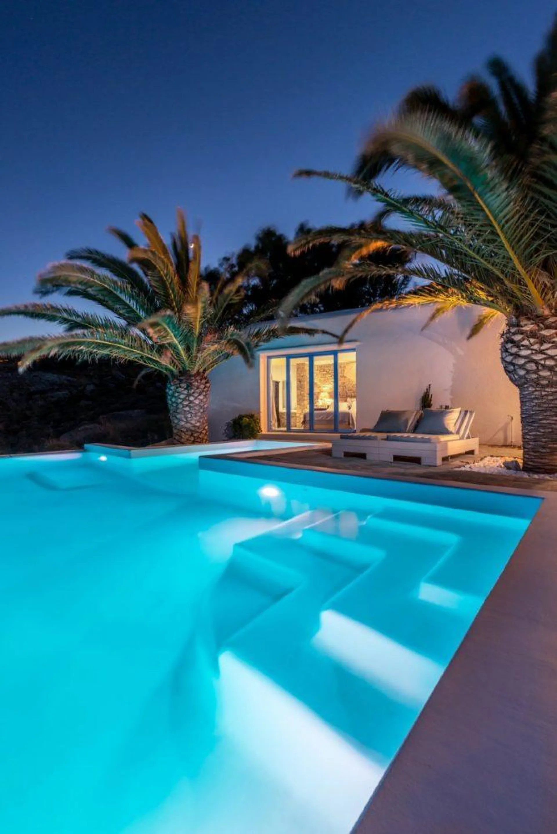 A glamorous and beautifully presented, fully integrated, high-specification contemporary villa for rental on the exclusive Elia Beach in Mykonos, Greece. This luxury villa comprises five bedrooms and bathrooms sleeping up to eleven people in total comfort. Set in its own landscaped grounds high above the chic beach of Elia. The beautifully interior-designed villa has spectacular panoramic sea views across the azure Aegean Sea to Naxos and Paros in the distance. Villa Michelle is perfect for groups of friends or a large family, all rooms are fully accessible from within the villa without the need to access any rooms from outside. Elegantly split level and predominantly arranged over two floors, the villa is airy and light with large windows and glazed double doors opening onto covered and uncovered terraces all of which interconnect, giving a combination of privacy and accessibility. Surrounding the house the spacious gardens have been thoughtfully planned with plenty of private areas, shaded spots for when the sun gets too much, as well as shaded and sunny dining spaces to give flexible use of both the inside and outside areas whatever the weather.
