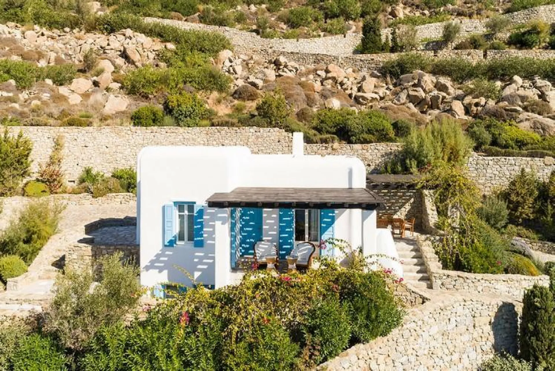 Mykonos Villa Miya 11 is at the center of a private 11-Villa Resort and enjoys a bird’s eye view of the islands of Delos and Rhenea, a majestic drop to the sea, and the picture-perfect Mykonos sunset. Villa Miya 11, boasts an outdoor BBQ and an outdoor dining & sitting area (sunny & shady all day long)- all in front of the Aegean horizon- and you are still less than a two-minute walk to the sea (still within the resort). Villa Miya 11 is uniquely ideal for couples, or families with older children vacationing together, who still want some privacy and want to enjoy an outdoor mini-pool with hydromassage and in-place swimming. A main entrance, dining room, living room, and kitchen, on the upper level, lead to 2 bedrooms (1D +2S) that share a bathroom. Through a separate entrance, on the ground level, is a large bedroom and a bathroom, a kitchenette, and a living-dining area. The white interiors and exteriors and the subtle tasteful decorations reflect the Mykonian-elegance the island is known for, so you can totally immerse yourself in the spirit of the island. The refurbished luxury estate has daily, complimentary maid service so you don’t lift a finger, 24/7 CCTV monitoring at the periphery of the estate- so unauthorized people are detectable, Netflix- to quench your thirst for relaxed adventure, flat-screen TVs- so everyone can watch, back-up generators- to face the frequent local electric shortages, a desalination plant- so you can ignore the frequent local water shortages, and a 24/7 gate-access control. Mykonos Villa Miya 11 offers exclusive, luxurious privacy just minutes from the island’s most notorious beaches, the most eclectic nightlife entertainment, and the most remarkable dining experiences that Mykonos is so famous for. The villa showcases its Mykonian elegance and is perfectly nestled within the 24/7 access-controlled property where tranquility, sunsets, and a courteous concierge can accompany or accommodate any desire and ensure that you can concentrate on indulging in unforgettable revelry and/or relaxation. To add to this, the property is uniquely protected from winds, so you can spend your time outdoors even when the rest of the island is windy.