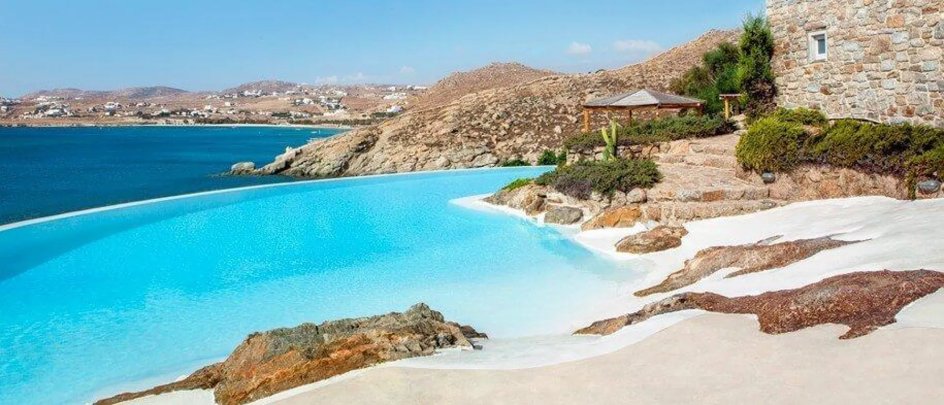 The house shows a beautiful contemporary all-white decor with an impressive collection of artwork and a grand piano in the living room. Massive rocks reveal the island’s natural environment used as a backdrop in the formal indoor dining area and well-appointed modern kitchen. The room grants easy access to the outdoor dining area through French doors opening directly onto the front pool terrace. Villa Oasis bedrooms are divided among the three levels of the property. A must to mention is that the master bedroom has a cave-like shower bathroom. All bedrooms allow access to a terrace while offering extensive sea views both indoors and outdoors and the benefit of direct access to the pool terrace.
