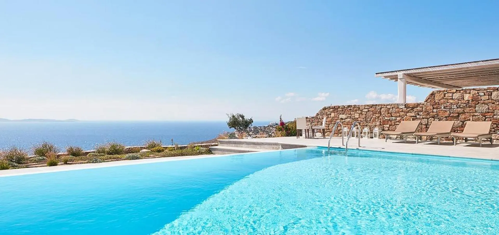 The pool terrace offers stunning sea views and overlooks Delos Island. The loungers next to the private infinity pool are ideal for those who want to return suntanned. For the rest, who prefer to stay in the shade, a pergola is an excellent option. You can also enjoy romantic sunset dinners there!