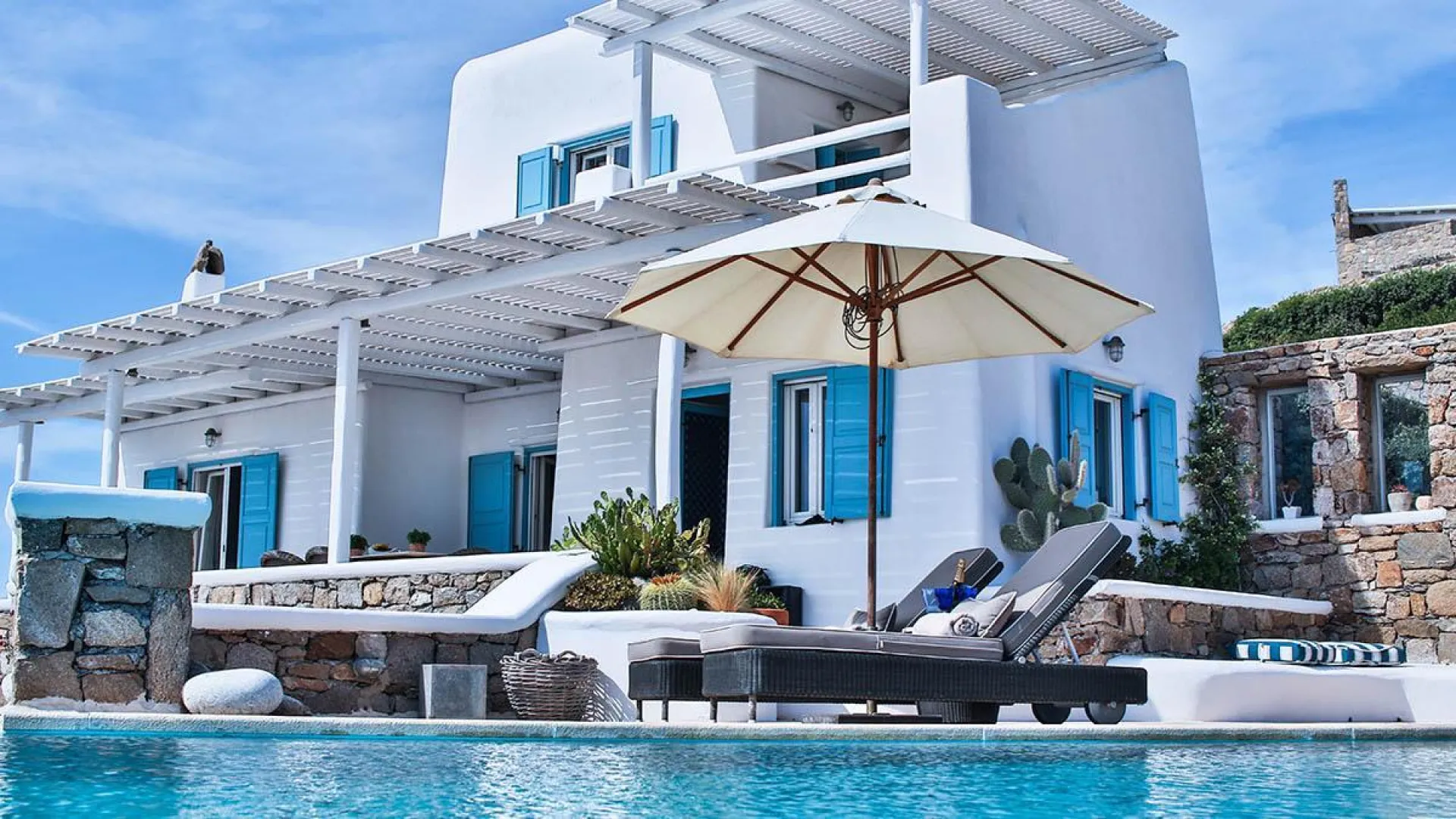 Houlakia Bay, with uniquely shaped pebbles of natural interest, is very close (300m), as well as Mykonos Town (5 km) and Saint Stefanos Beach (2km).