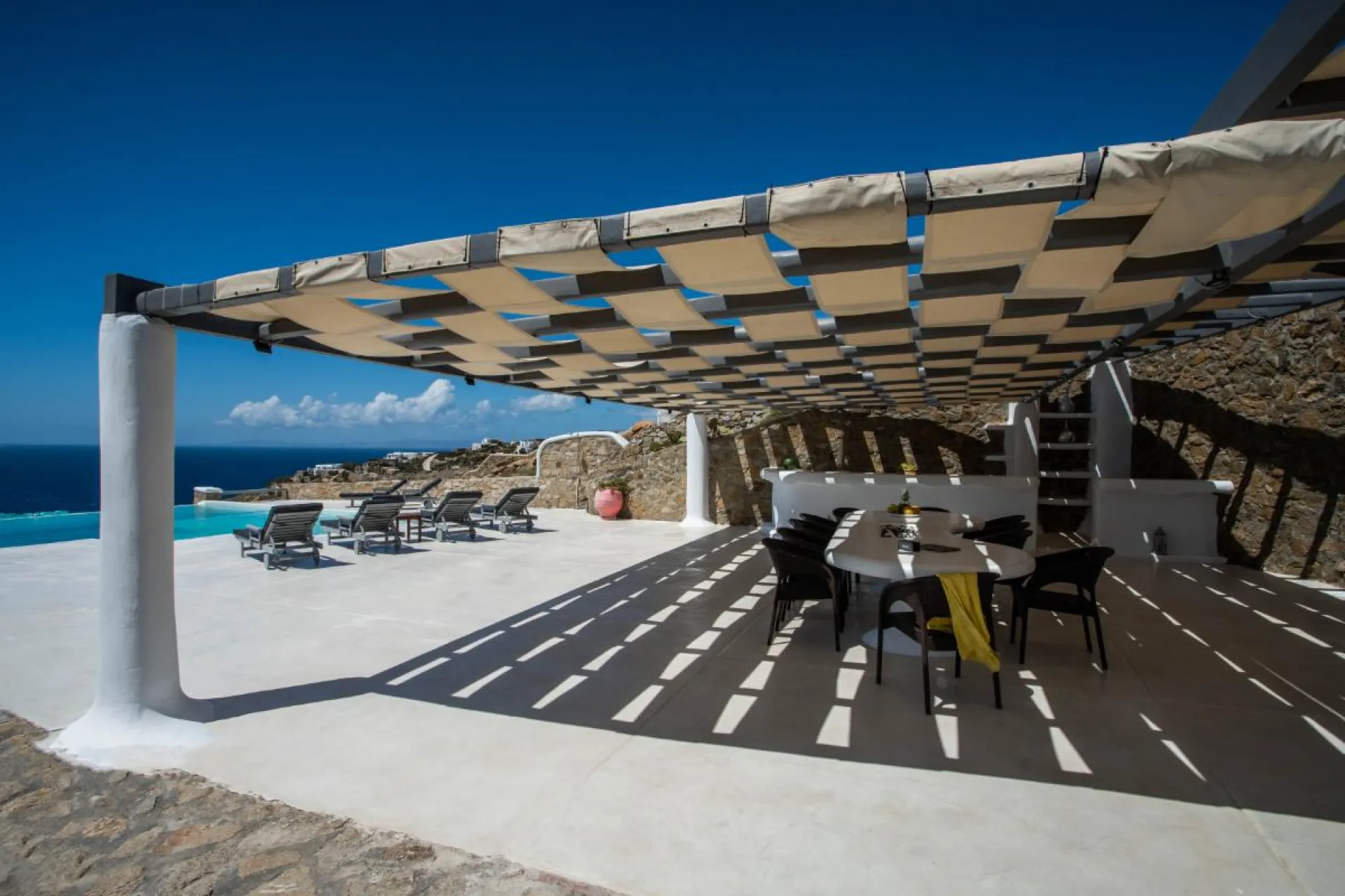This beautiful villa, located in the privileged location of Houlakia can host up to 10 persons. This spacious villa offers combines privacy and tranquillity with beautiful landscapes and spectacular views of the Aegean sea and only a few minutes away from the nightlife and the famous restaurants of the island.