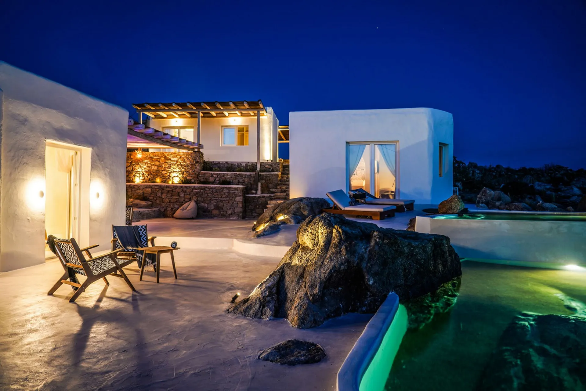 The villa’s architecture and landscape design is inspired by traditional Mykonian Villages. Early settlers built their houses close to one another, and close to sweet water sources. A cluster of five places was considered a village. You will observe many curved walls in Mykonos, which are shaped like this not for aesthetic value, but to protect the buildings from, and to reduce the howling of the Cycladic winds.