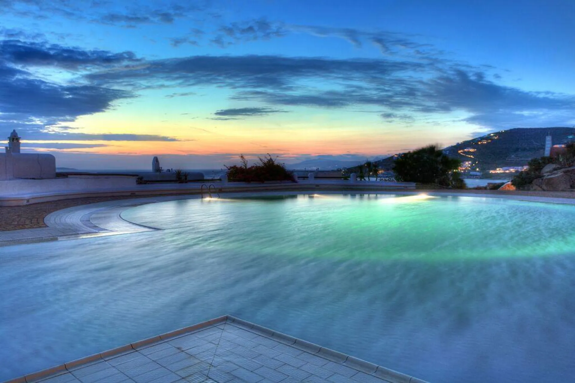 The beautiful 4-bedroom Villa Portman is located in a residential complex in Agios Ioannis, just 4 km from Mykonos town and less than 3 km to Ornos. The three-story villa consists of 4 bedrooms with double beds, spacious sitting areas, and nice terraces with amazing sunset and sea views. There is also a dining area and a fully equipped kitchen. The complex shares one of the largest pools on the island! Moreover, it is only a few minutes walk from a semi-private beach!!! The property has great views of the sea and the famous Mykonian sunset.