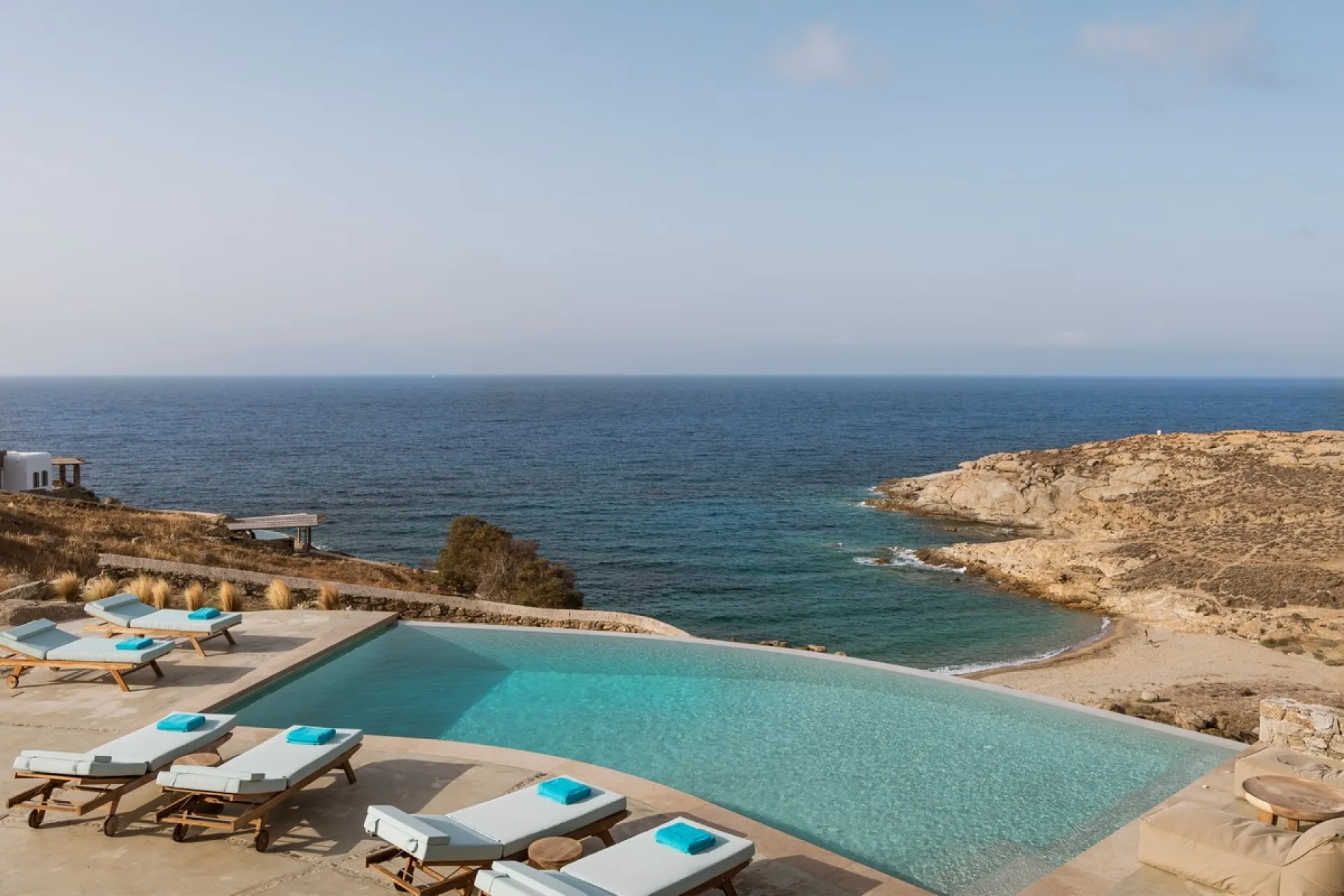 Step outdoors into your own Mediterranean paradise, where an infinity-edge pool melts into the sea-blue horizon. Sun loungers line the pool deck, inviting restful days under the sun, while a shaded al fresco BBQ and dining area becomes the heart of warm Mykonian evenings.