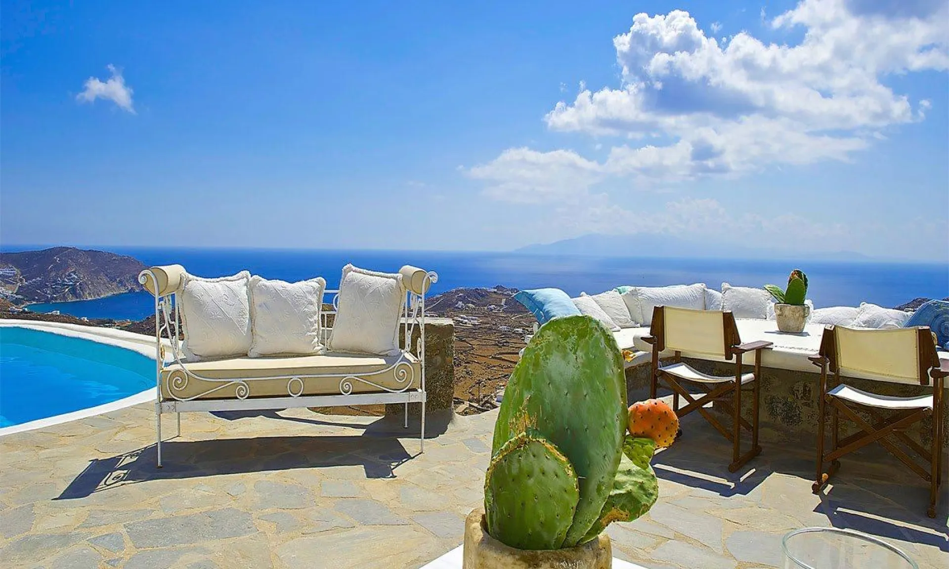 Villa Ramsey celebrates traditional Cycladic architecture of whitewashed walls and traditional stone, blends into the striking environment of natural rocks and cactuses, surrounding the property, offering magnificent views from various sitting corners of the villa.