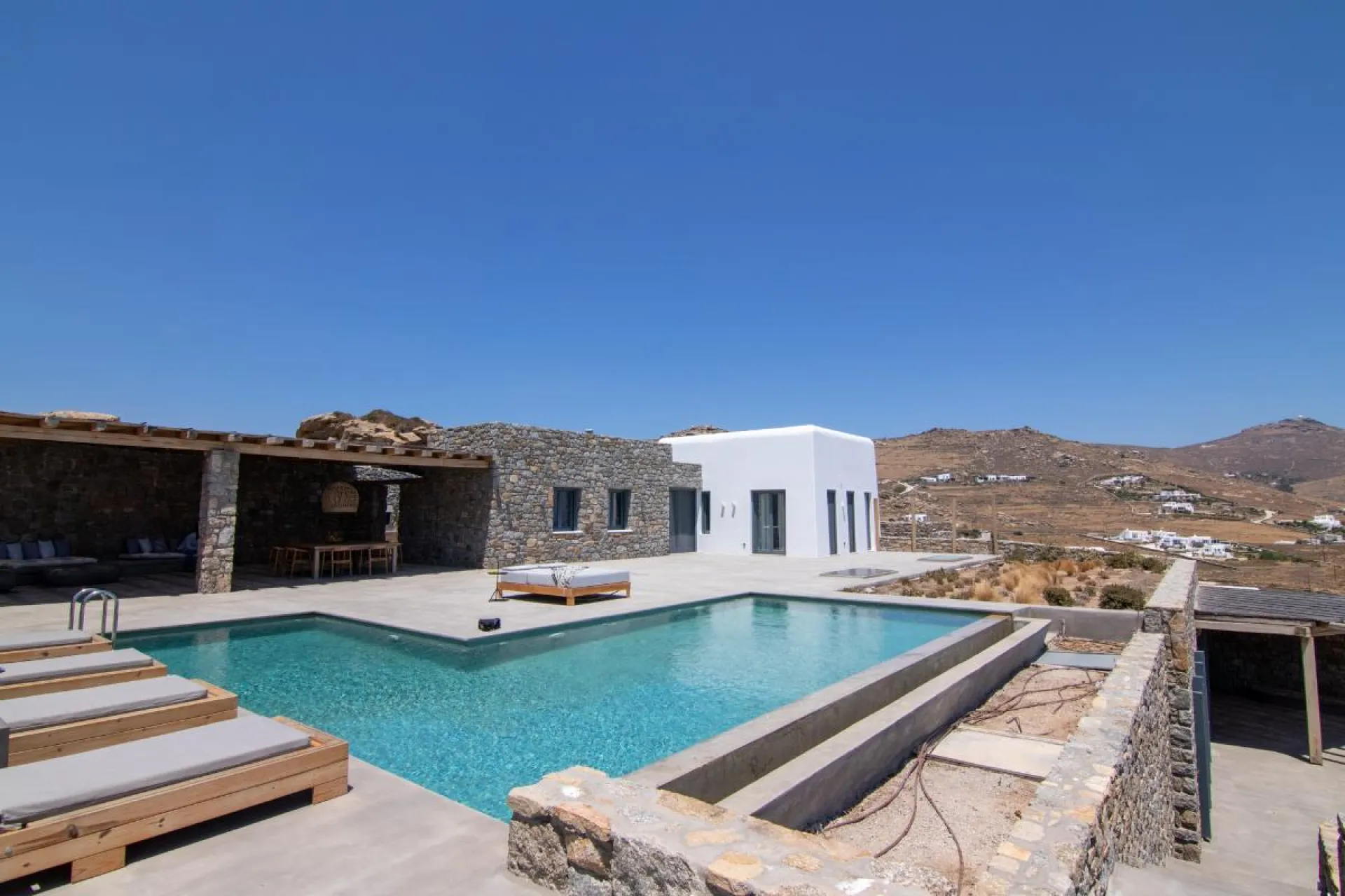 Prepared to be bewitched by the exceptional Villa Savalas. Perfectly set on a slopped terrain overlooking the bay of Kalafatis with azure blue sea views whose charm will outlast your stay. Ever y detail speaks of understated elegance: furnishings in muted tones, warm woods,pergola shaded lounge, and local stone combines for a luxurious, relaxed ambiance. Be spellbound, by minimalist living areas stunningly punctuated by panoramic glass doors directly connecting the interior to the sun-drenched landscape of Mykonos.