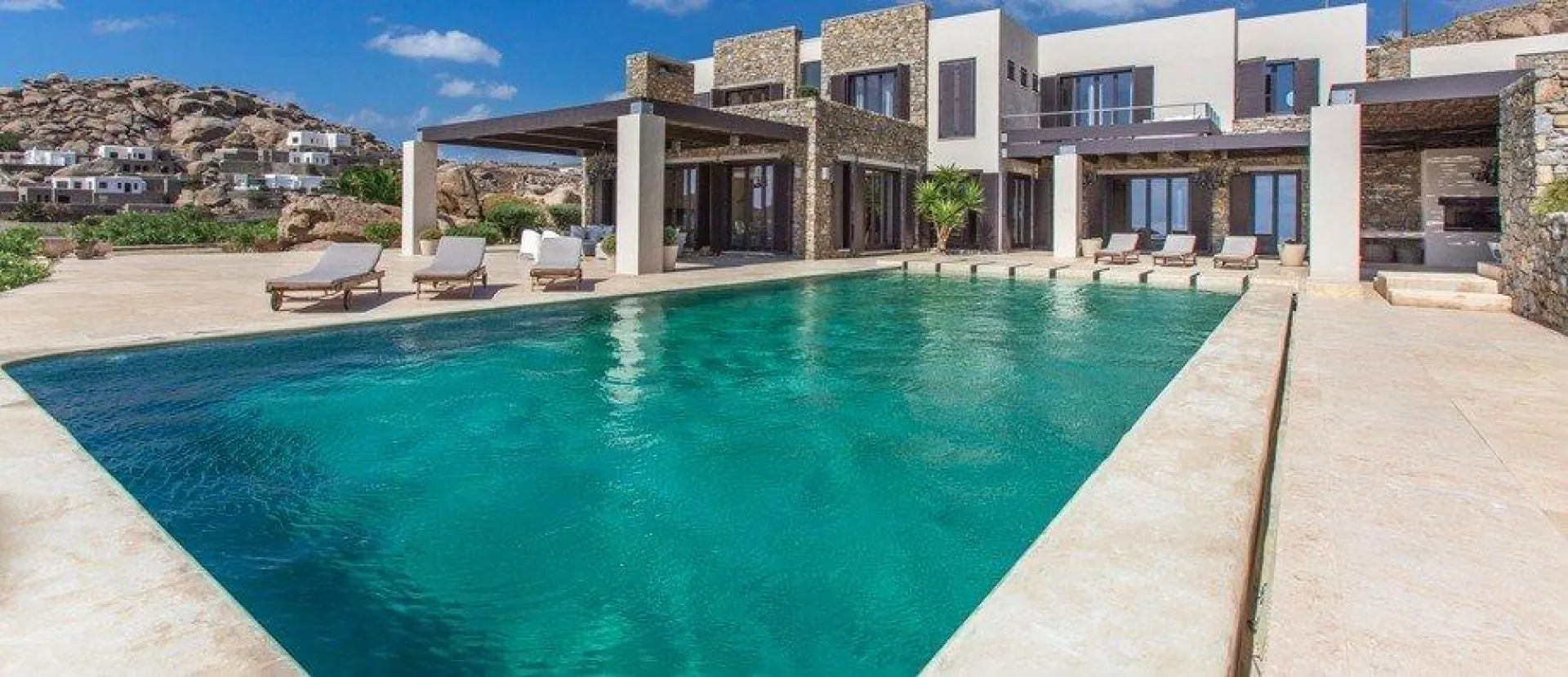 The spacious pool terrace covers the entire front of the property with its graceful stone tails. The private infinity edge swimming pool, with its unique structure, is located in the most panoramic position on the terrace directly overlooking the golden sands of Super Paradise Beach. The two large pergolas are located on each side of the pool, one with clever summer furniture for time off and the other with the formal outdoor dining area equipped with a stunning wooden dining table and a wood-fired BBQ.